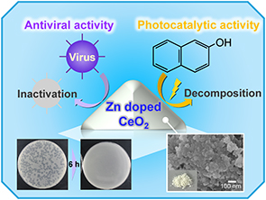 After Zn-doped CeO2 (CZnO) was synthesized using a hydrothermal method, its antiviral activity was evaluated under dark and visible-light conditions. The obtained sample was a white, single-phase powder with a fluorite-type crystal structure. Compared with undoped CeO2, CZnO exhibited a smaller lattice constant and a larger specific surface area. Its antiviral activity was assessed in accordance with ISO standards using an enveloped virus (bacteriophage Φ6) and a non-enveloped virus (bacteriophage Qβ). Even in the dark, CZnO showed distinct antiviral activity against both viruses, with stronger effects observed for Φ6. Detailed analyses indicated that particle size, released ions, and surface charge contributed to the antiviral behavior under dark conditions. Under visible-light irradiation, the antiviral performance of CZnO was enhanced further, with a particularly pronounced effect found against Qβ. This enhancement is attributed to photocatalytic effects: Zn doping was found to narrow the band gap and increase photon absorption. These findings indicate CZnO as a novel inorganic antiviral material capable of exhibiting antiviral activity under both dark and visible-light conditions without the need for any co-catalyst or rare-earth dopant.