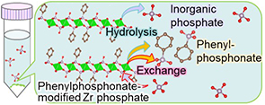 In this study, the release of phosphorus oxyacid species from organically modified layered zirconium phosphate was investigated. Zirconium phosphate was modified by partially incorporating phenylphosphonate by heating a mixture of phosphoric acid and phenylphosphonic acid under reflux. Characterization by powder X-ray diffraction, Fourier transform infrared spectroscopy, and thermogravimetric analysis confirmed that approximately 50 % of the phosphate groups in the zirconium phosphate framework were successfully replaced by phenyl groups. Upon immersion in Tris-hydrochloric acid buffer for 168 h, both inorganic phosphate and phenylphosphonate were released. In contrast, in phosphate-buffered saline, phenylphosphonate was eluted while inorganic phosphate from the solution was incorporated into the material. These results suggest that zirconium phosphate modified with phenylphosphonate can serve as a potential material for imparting phosphorus oxyacid-based drug-releasing functionality to zirconia-based dental materials.