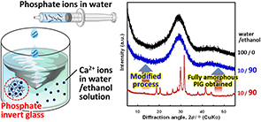 Phosphate invert glasses (PIGs) are promising biomaterials because of their ability to release ions and their biocompatibility. Using water-based liquid-phase methods, PIGs can be synthesized at ambient temperature and pressure. However, the compositional range is limited owing to the hydrolysis of water-sensitive raw materials, such as NbCl5 and TaCl5, which produce insoluble hydroxides and oxides. Thus, the incorporation of tantalum (Ta) and niobium (Nb) into the PIG network structure is difficult, despite their ability to enhance chemical durability and introduce biological functionalities. In this work, an ethanol-based liquid-phase method was developed to prepare PIGs for certain water-sensitive raw materials. The ethanol content in the method is significantly related to the glass network structure and crystallization behavior. PIGs without crystalline phases were obtained with ethanol content up to 50 %, whereas higher ethanol content led to partial crystallization of K2CaP2O7. Modifying the process can suppress crystallization at the high ethanol content, allowing the preparation of PIGs without crystalline phases. Thus, the proposed method can be used to prepare crystallization-free PIGs containing water-sensitive elements.